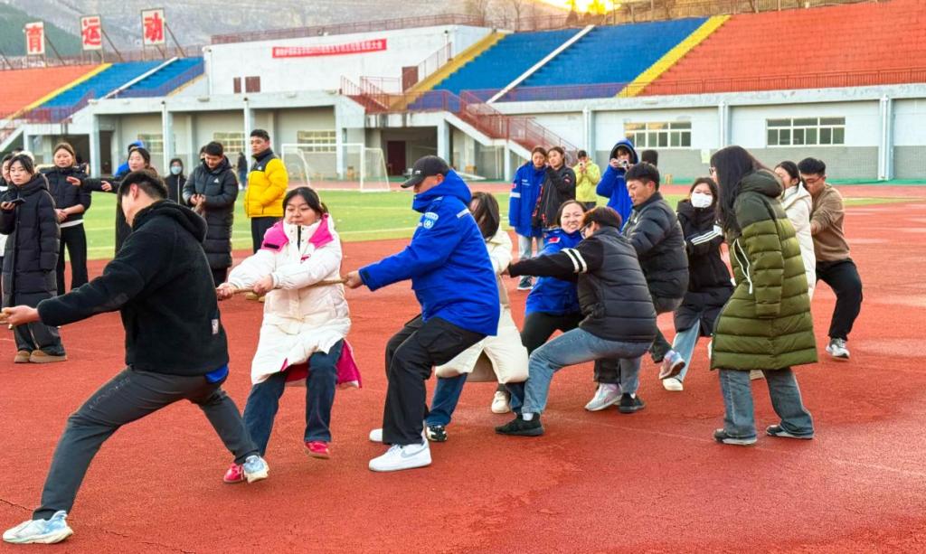 赛前,各参赛队伍提前到场有序热身,围坐研讨战术、明确分工,摩挲绳索熟悉手感,满怀自信与期待备战。裁判哨声响起,赛场瞬间沸腾!队员们凝神聚力、双脚蹬地、身体后倾,紧握绳索全力后拉,尽显拼搏本色。绳索红线来回拉锯,每一寸移动都凝聚着团队协作;场边拉拉队呐喊助威,与队员口号交织成激昂的赛场旋律。