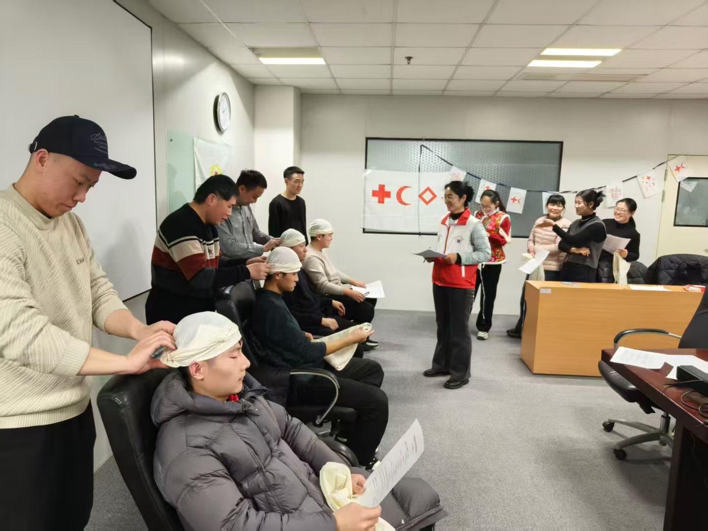 红十字救护概论、心肺复苏、创伤救护、常见急症等知识,包括理论讲授及实操环节。培训班为各位学员提供救护员教材一本、应急救护训练用品一套(包括呼吸膜一片、三角巾一个,绷带一卷)。