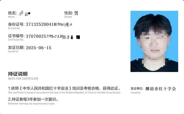 理论考试为线上答题,操作考核为现场考核。考核通过者10天内颁发最新版由潍坊市红十字会盖章的红十字救护员纸质版证书(如下图)。